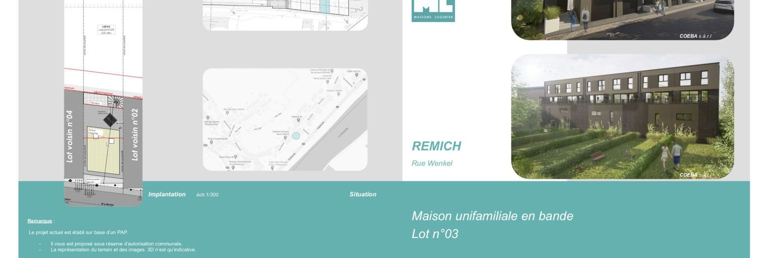 Maison unifamiliale en bande de +/-140 m2 surface habitable sur un terrain de 3,25 ares. Elle est composée comme suit: – au rez-de-chaussée: un garage pour deux voitures, un hall d’entrée, buanderie / local technique– 1er étage: cuisine ouverte, grand living avec accès sur la terrasse, réserve et un WC séparé– 2ème étage: une salle … Continue reading Lotissement “rue WENKEL”